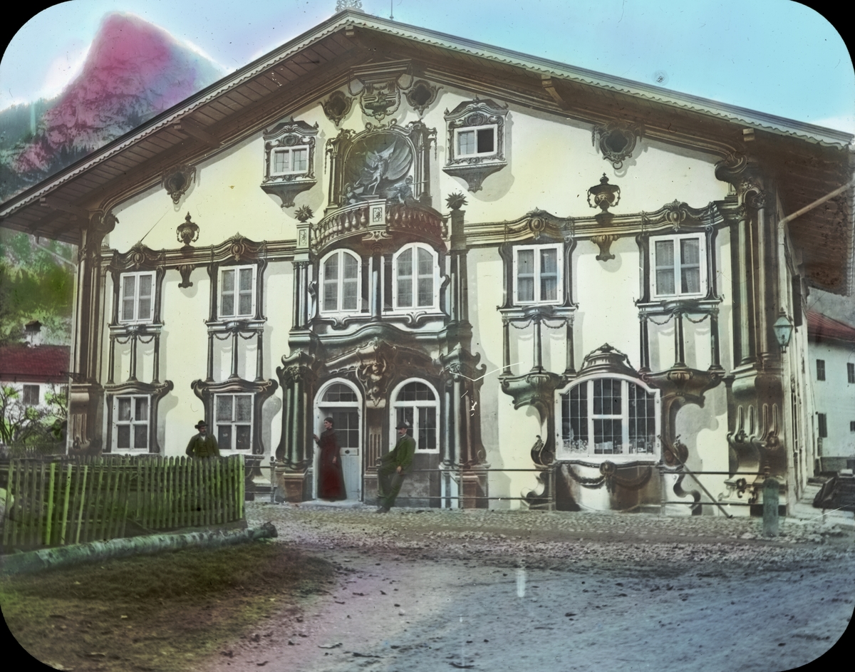 Ljusbild med rmotiv från Oberammergau med berget Kofel i bakgrunden.