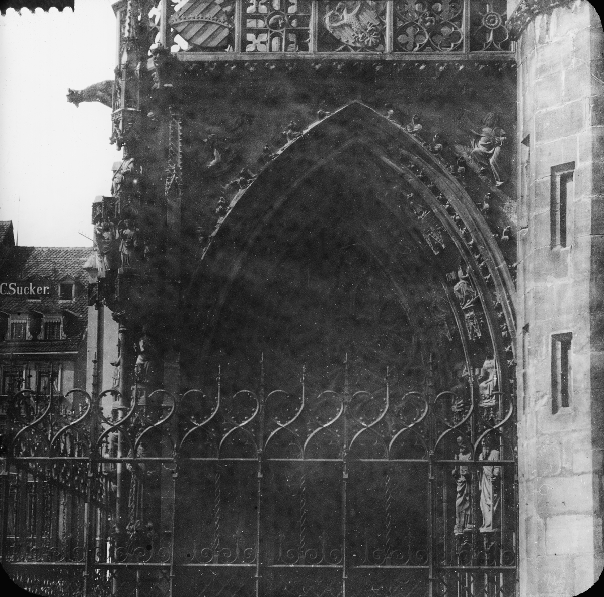 Skioptikonbild med motiv från Nürnberg. Möjligen Sankt Lorenz-Kirche eller Frauenkirche.