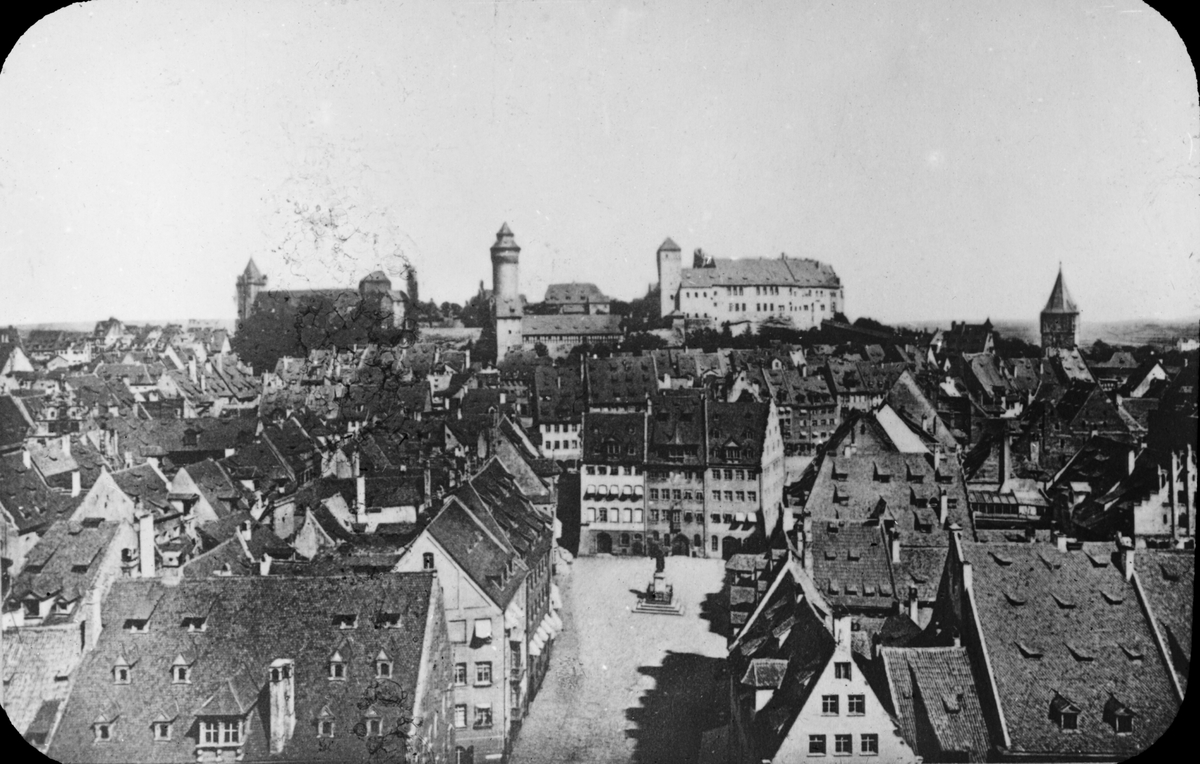 Skioptikonbild med motiv av vy över Nürnberg med Kaiserburg (Kejsarens Slott) i bakgrunden.
