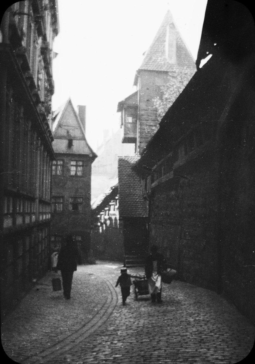 Skioptikonbild med motiv av gränd i Nürnberg.
