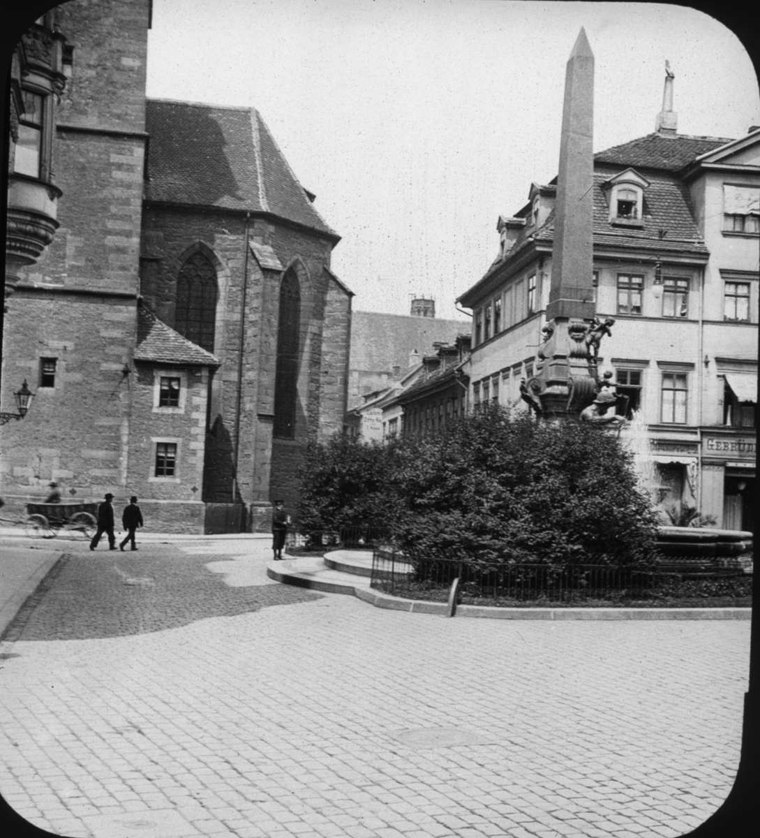 Skioptikonbild med motiv av fontän på torg vid katedralen i Erfurt.