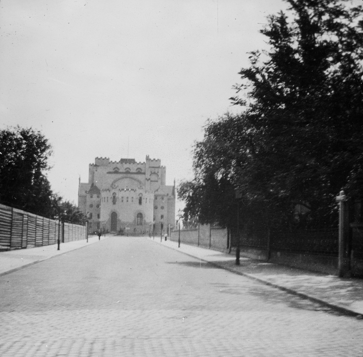 Bilden har förvarats i kartong märkt: Resan 1907.Goslar3. Halberstadt 5. 8. Text på bild: "Ny teater".