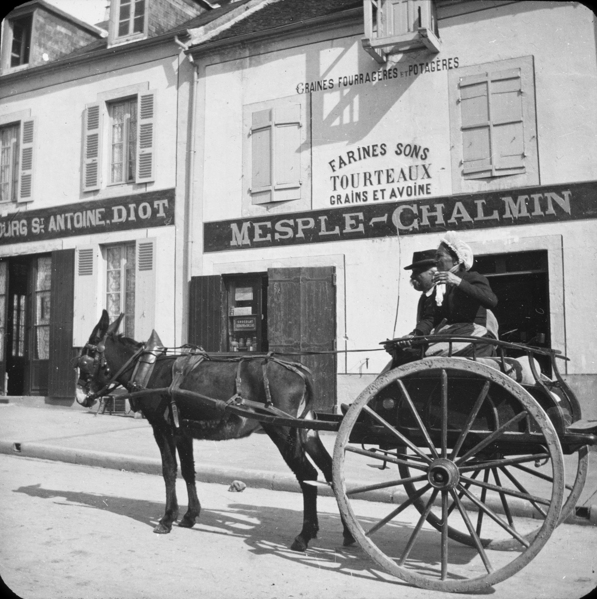 Skioptikonbild med motiv från Vichy. Kvinna och man med åsna och vagn.