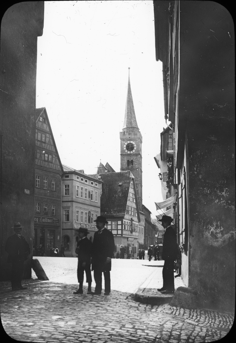 Skioptikonbild med motiv från Kolpingstrasse, Ochsenfurt. I bakgrunden syns kyrkan St. Andreas.