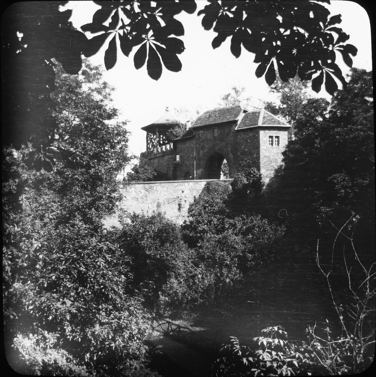 Skioptikonbild med motiv av valvport i stadsmuren i Friedberg.