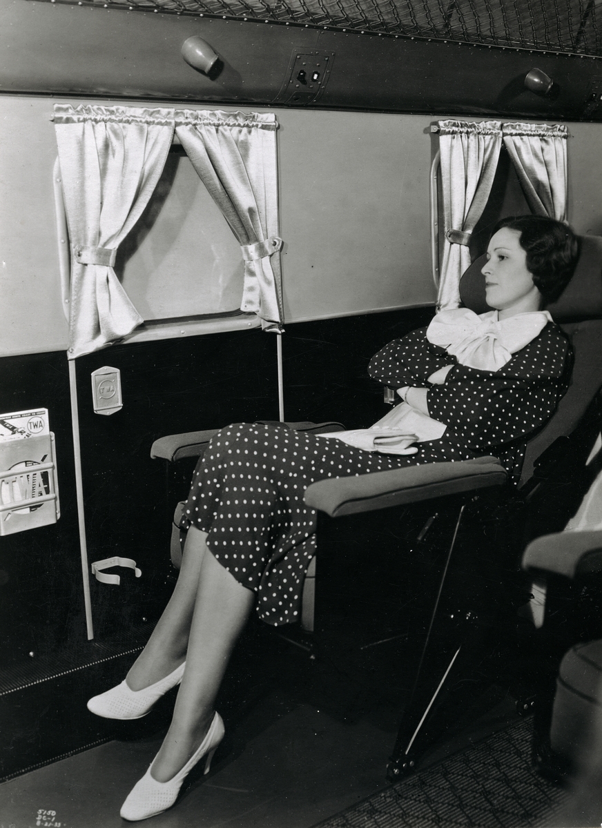 Interiör av ett Douglas DC 2 trafikflygplan, med ställbara fåtöljer.