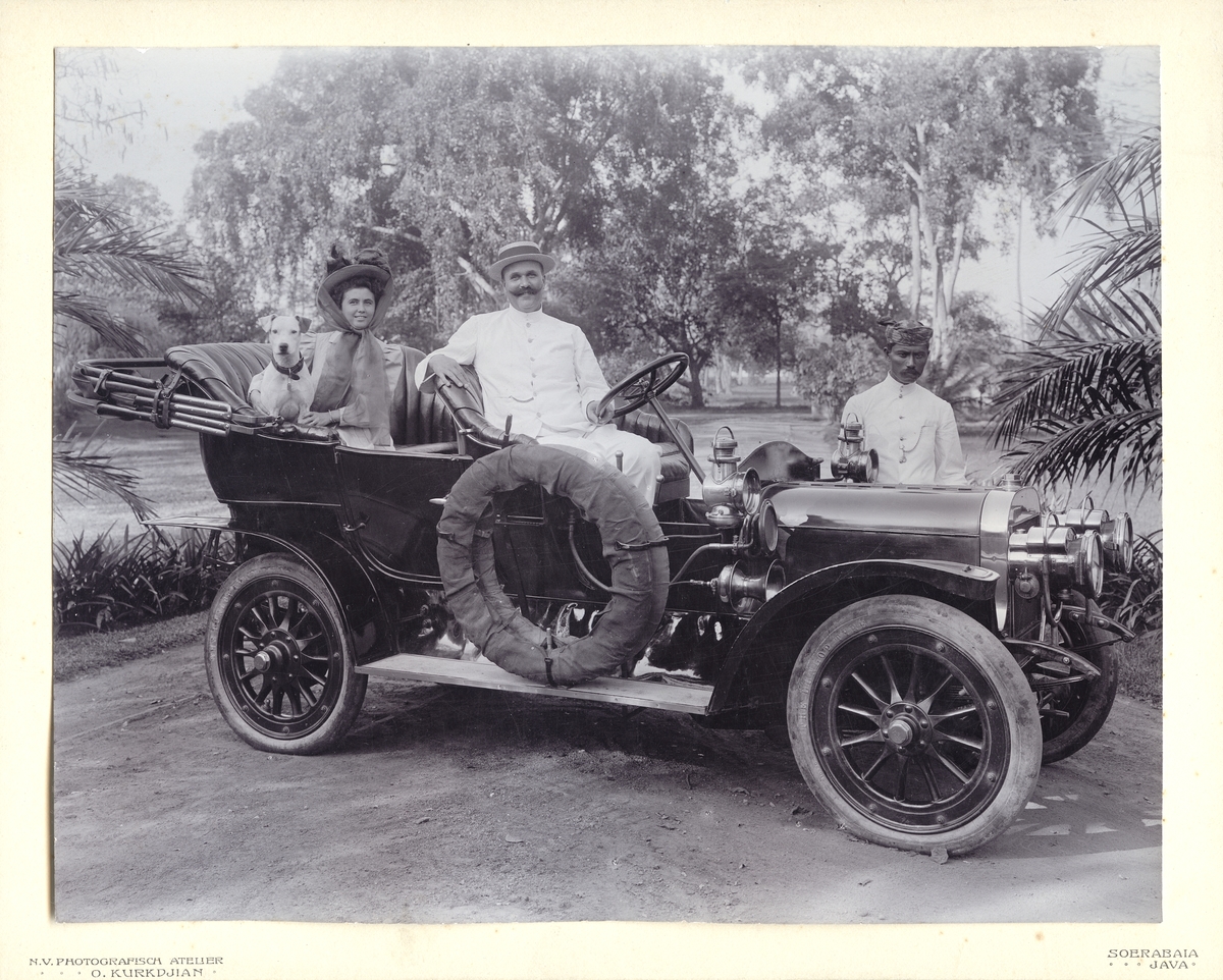Konsul Alfred Berg med fru Annie Berg i automobil på Java omkring 1912.