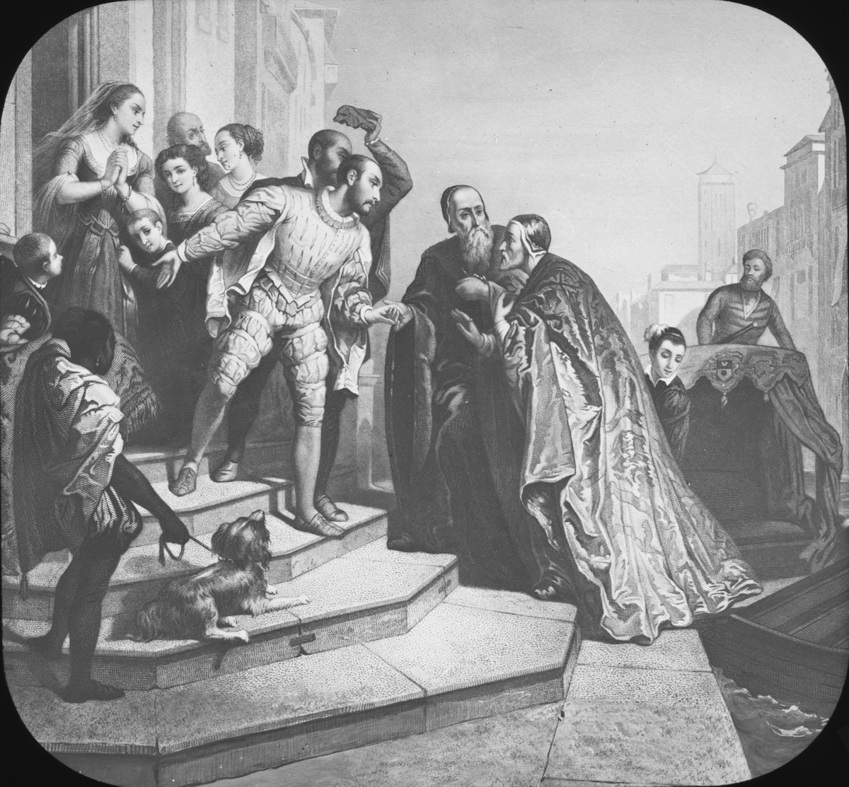 Skioptikonbild med målat motiv av ett möte i Venedig.