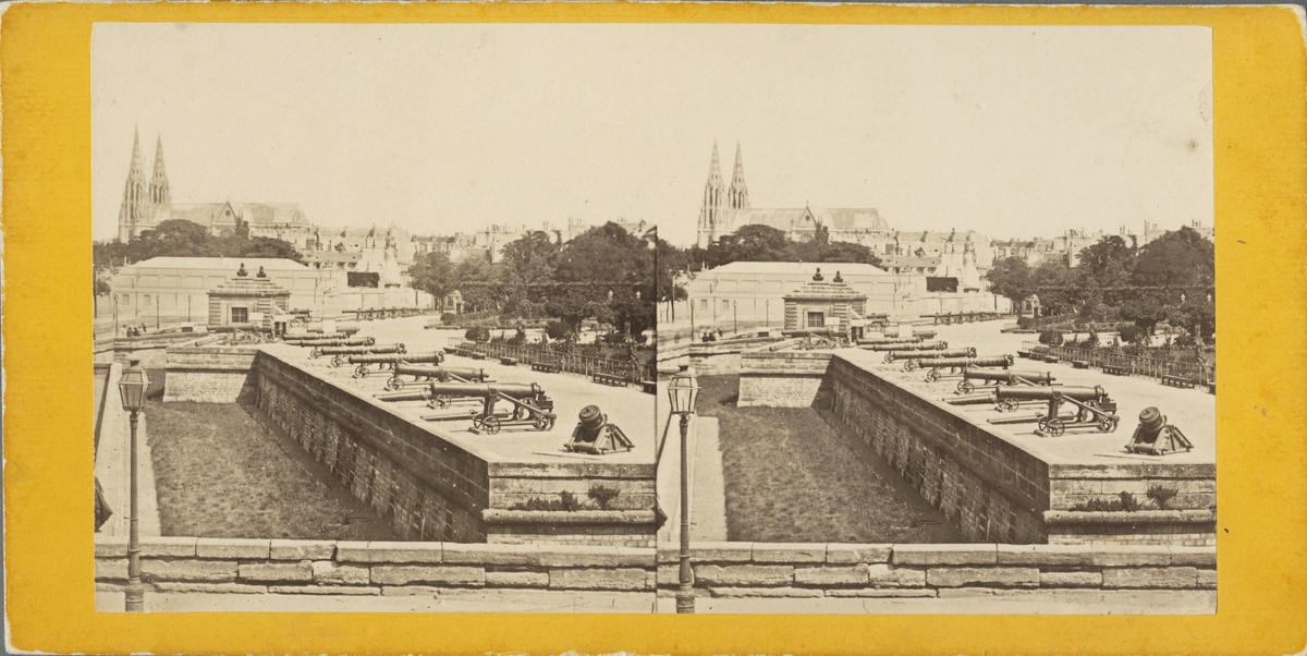 Stereobild med motiv av Hôtel des Invalides, kanoner och kyrka i bakgrunden.