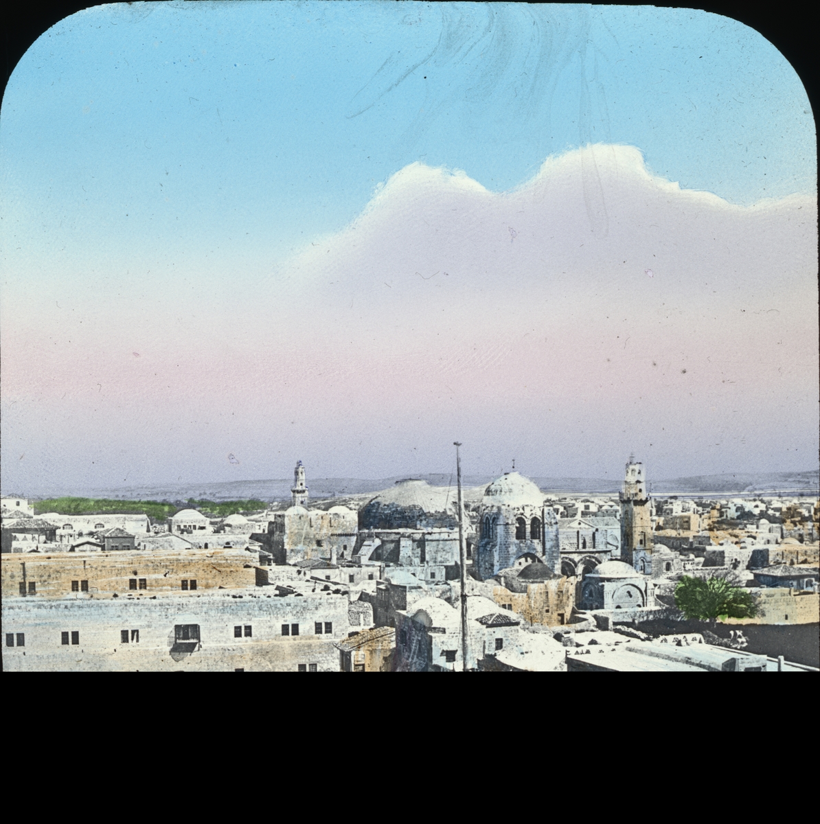 Kolorerad skioptikonbild med motiv av vy över takåsarna, okänd stad, Orienten.