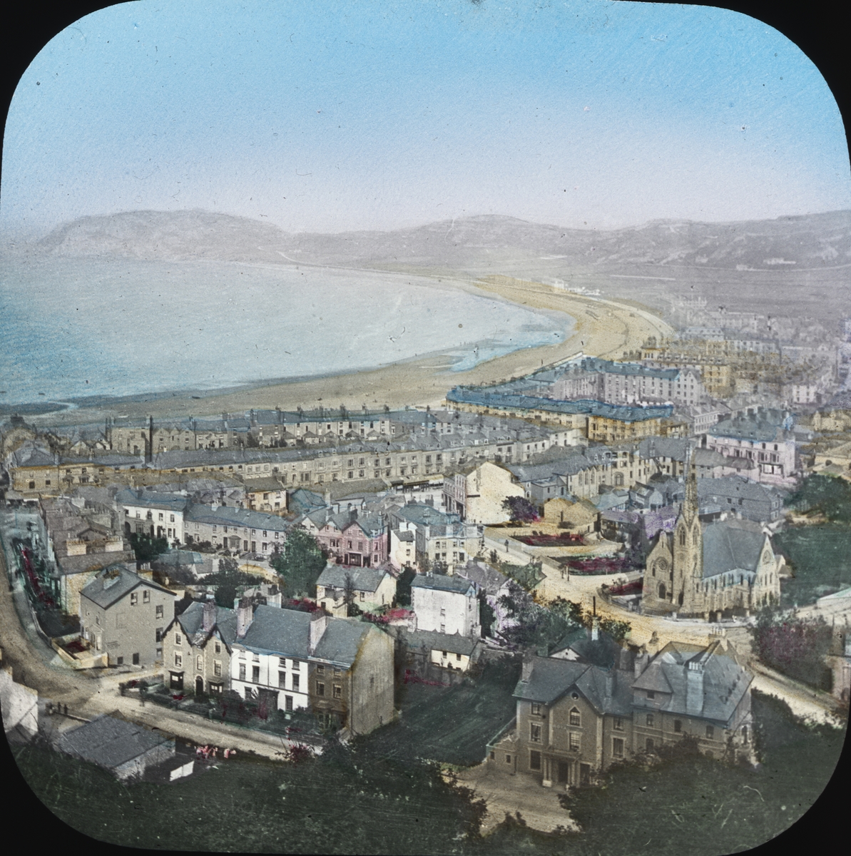 Kolorerad skioptikonbild med motiv av vy över okänd stad vid strand, vid bukt. Möjligen i England.