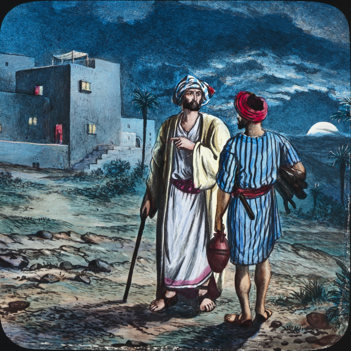 Kolorerad skioptikonbild med motiv från Orienten. Två män möts i öknen.