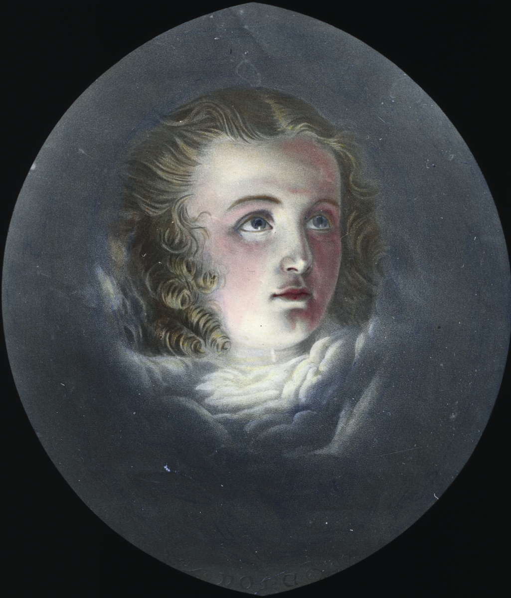 Kolorerad skioptikonbild med motiv av ett barn i himlen.