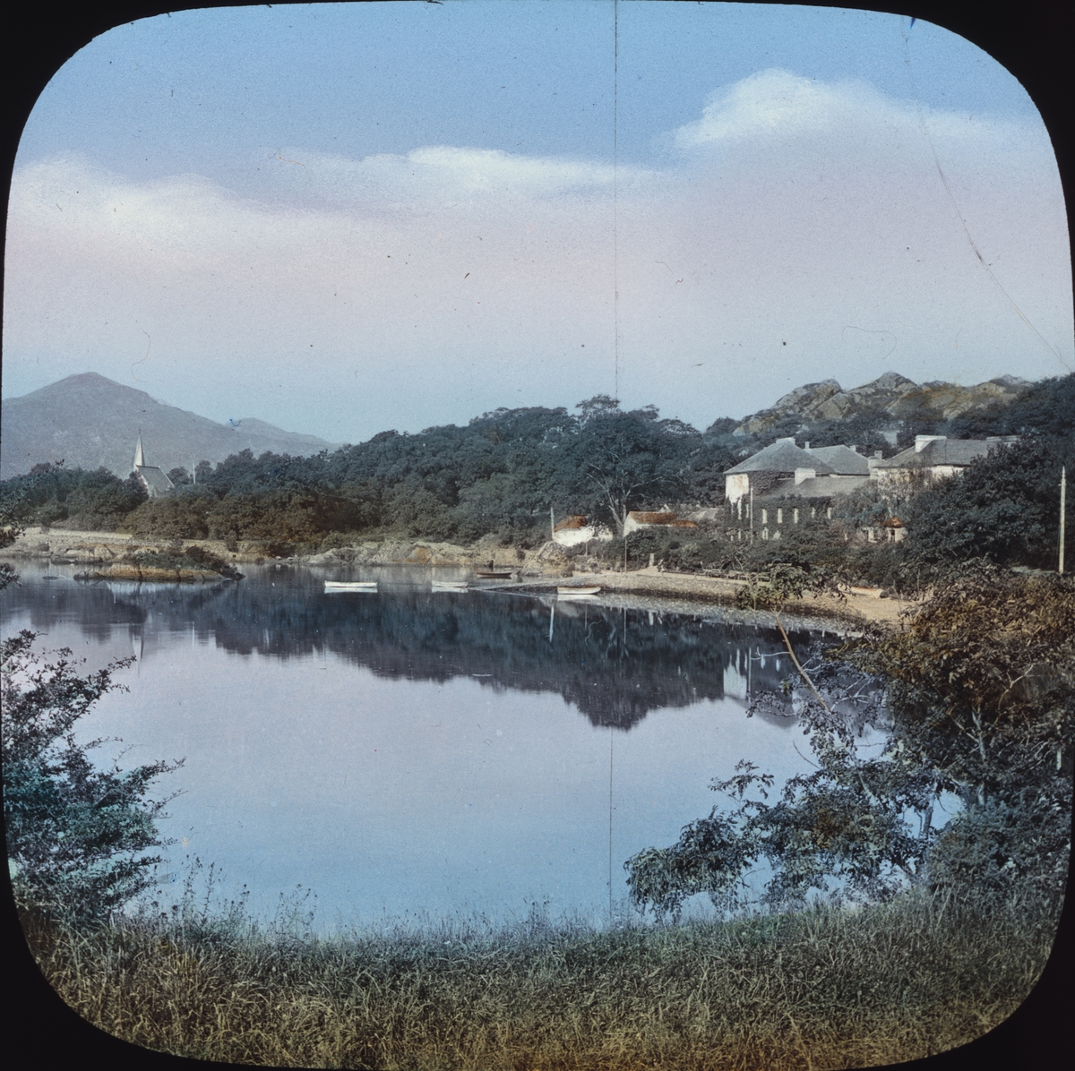 Kolorerad skioptikonbild med motiv av vy över okänd sjö, okänd plats.