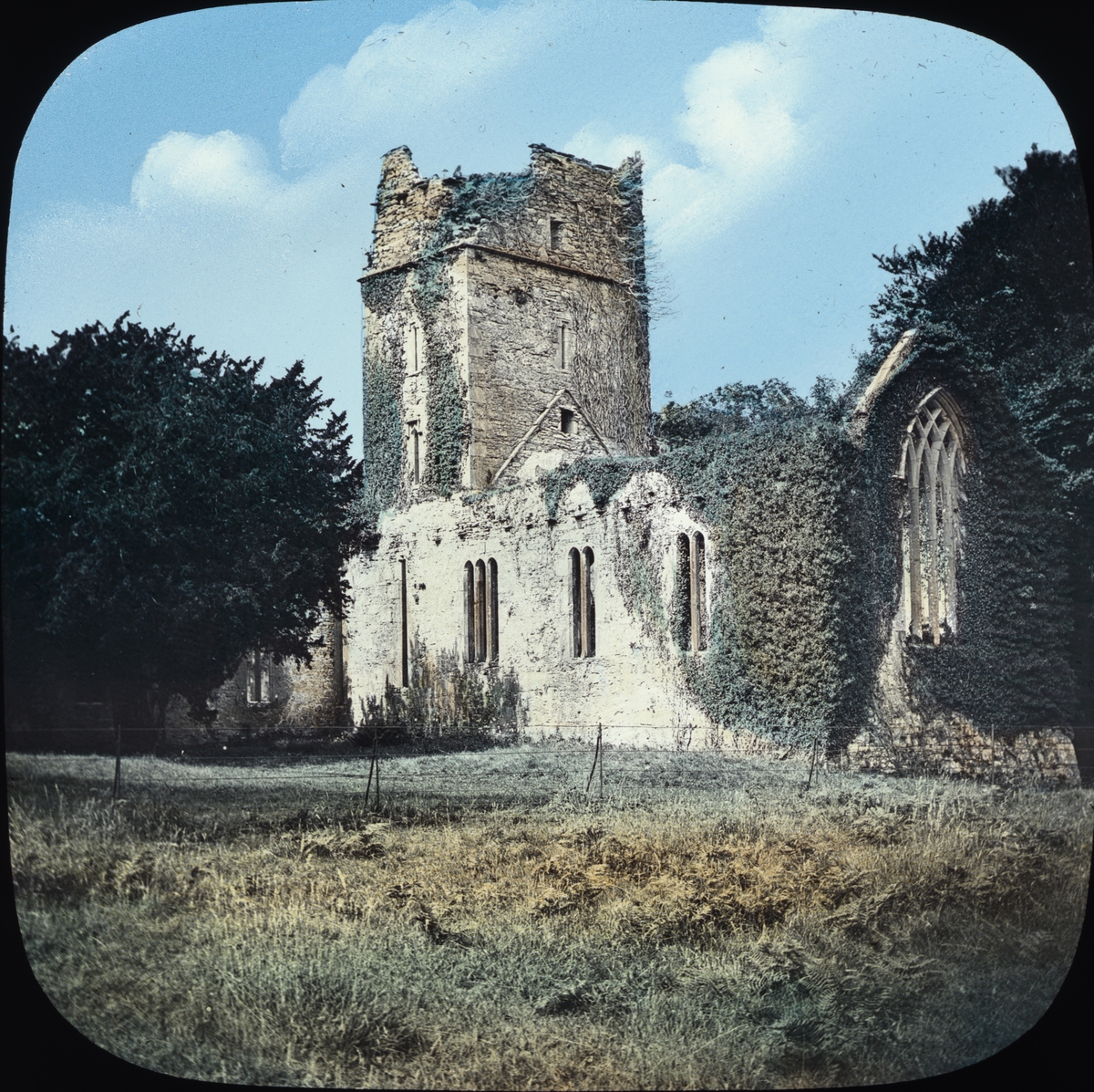 Kolorerad skioptikonbild med motiv av kyrkruin, okänd plats.