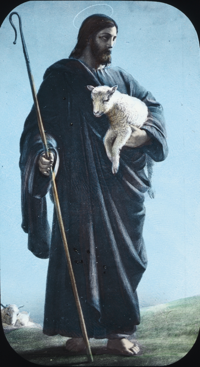 Kolorerad skioptikonbild med med religiöst motiv. Jeusu med ett lamm.