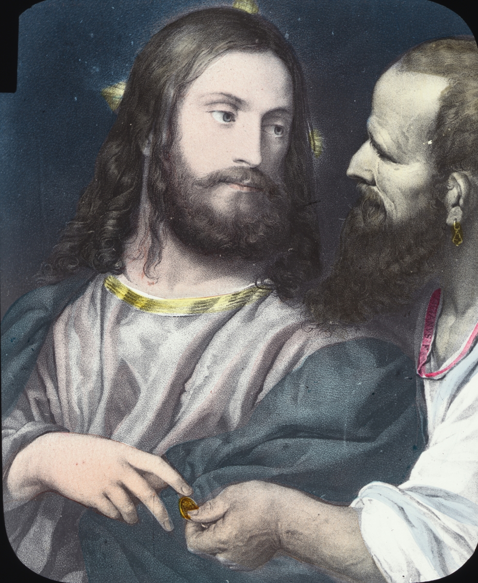 Kolorerad skioptikonbild med religiöst motiv av två män. Den ena är möjligen Jesus.