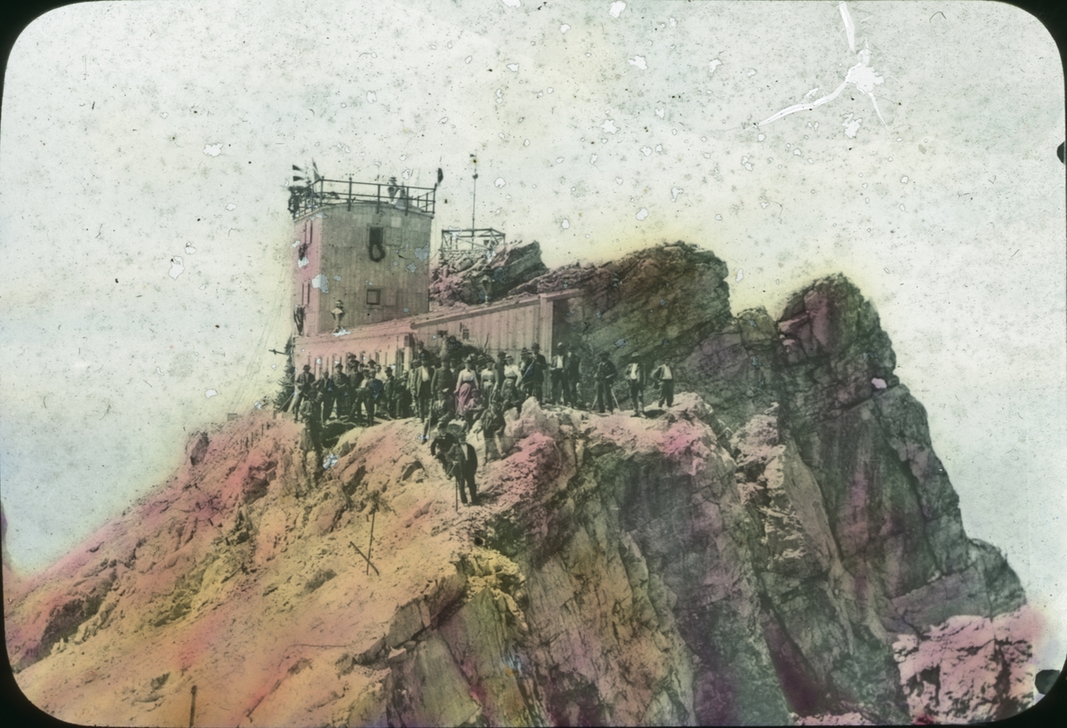 Kolorerad skioptikonbild med motiv av män vid befästning på klipptopp.