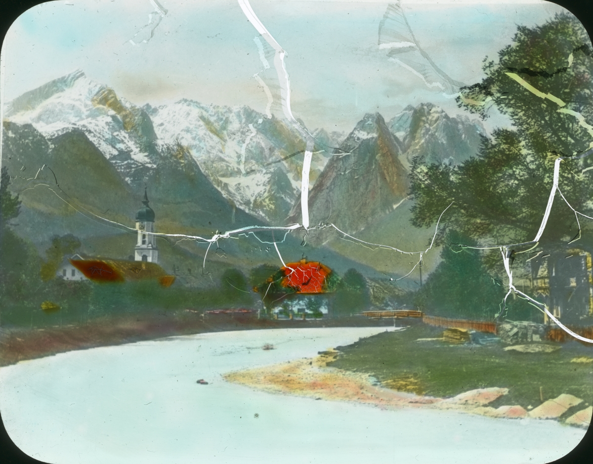 Kolorerad skioptikonbild med motiv av okönd flod i okänt bergslandskap.