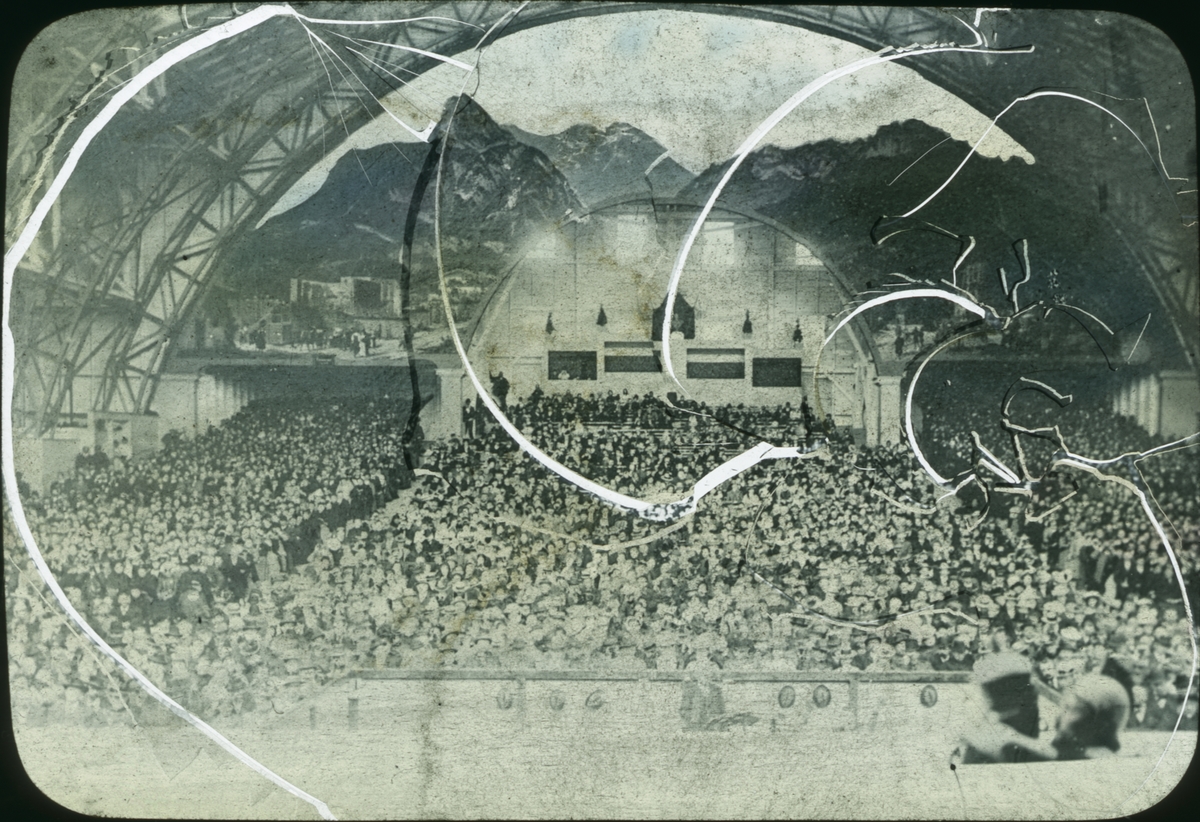 Kolorerad skioptikonbild med motiv av fullsatt teater, okänd plats. (Oberammergau?)