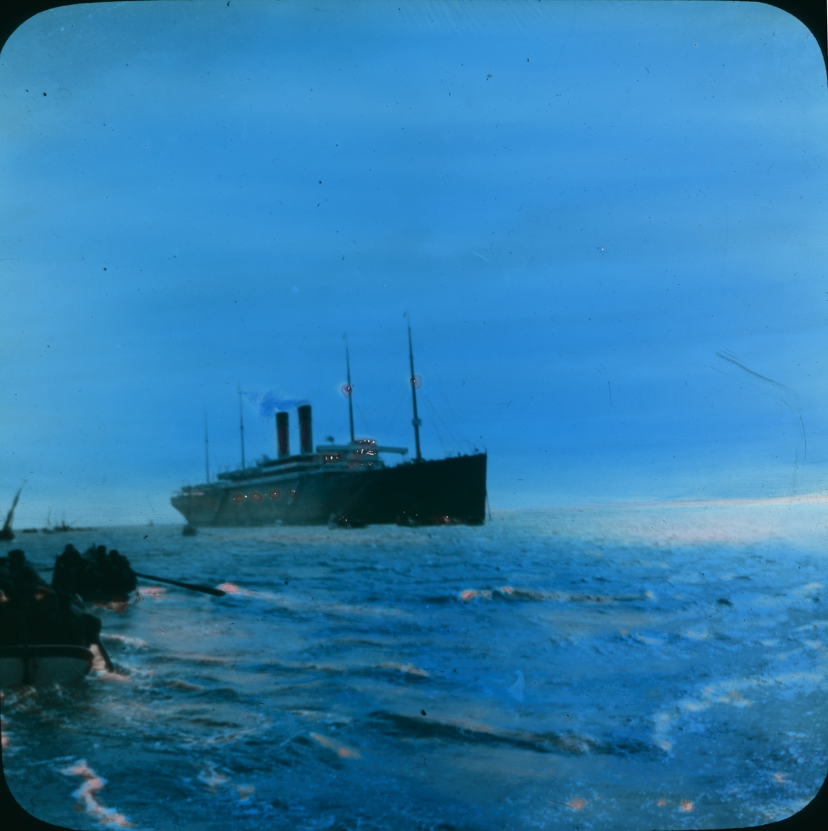 Kolorerad skioptikonbild med motiv av okänt fartyg på havet.