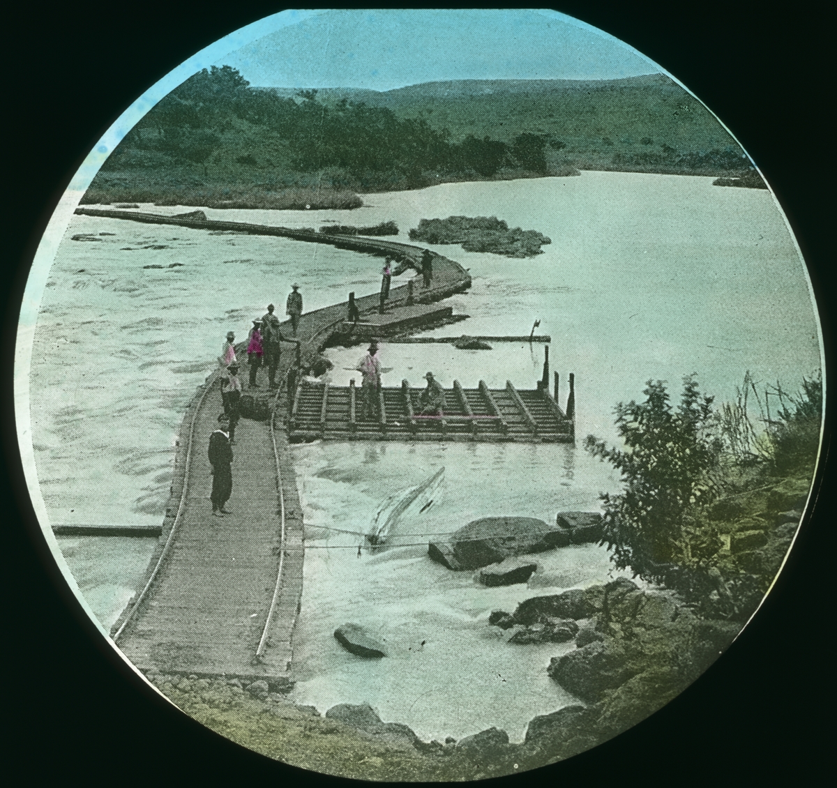 Kolorerad skioptikonbild med motiv av män på bro över okänd fors.