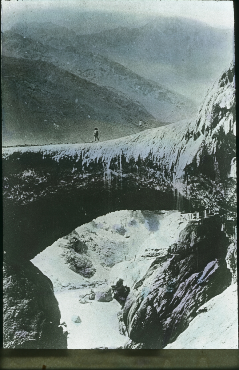 Kolorerad skioptikonbild med motiv av naturlig brygga, bro över okänd fors.