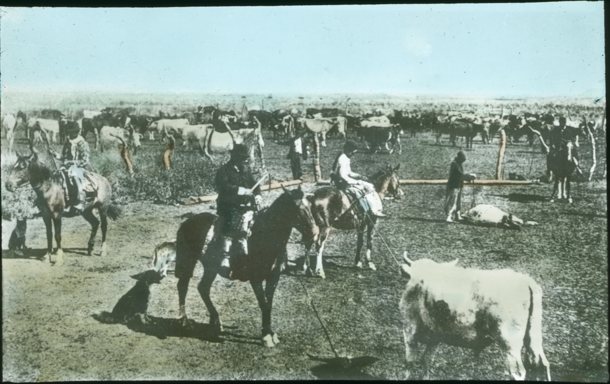 Kolorerad skioptikonbild med motiv av boskapsskötsel.