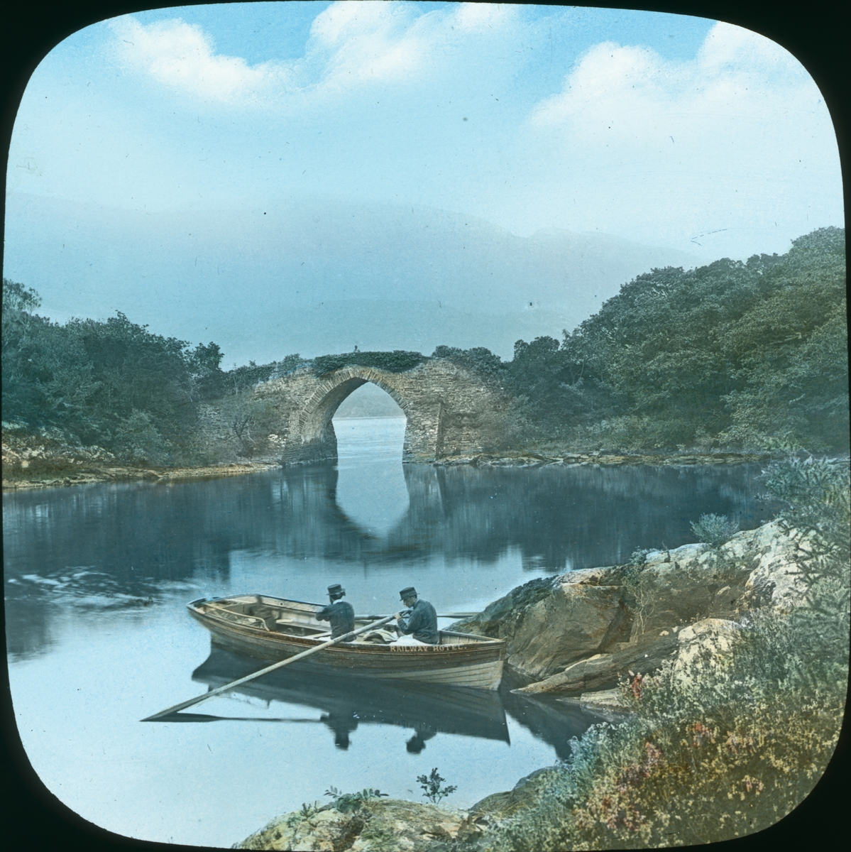Kolorerad skioptikonbild med motiv av män i roddbåt på okänd sjö.