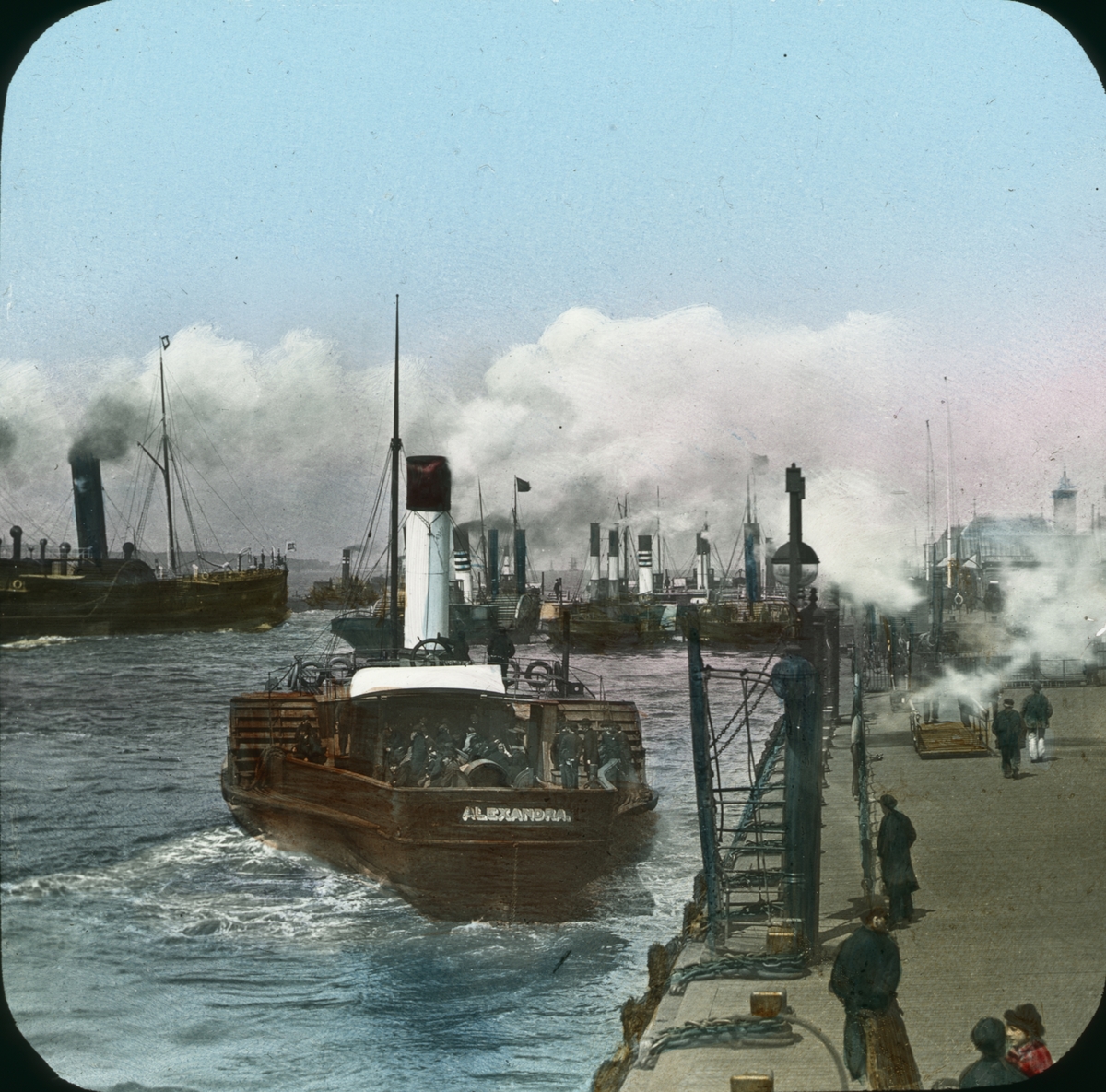 Kolorerad skioptikonbild med motiv av ångfartyg i okänd hamn.