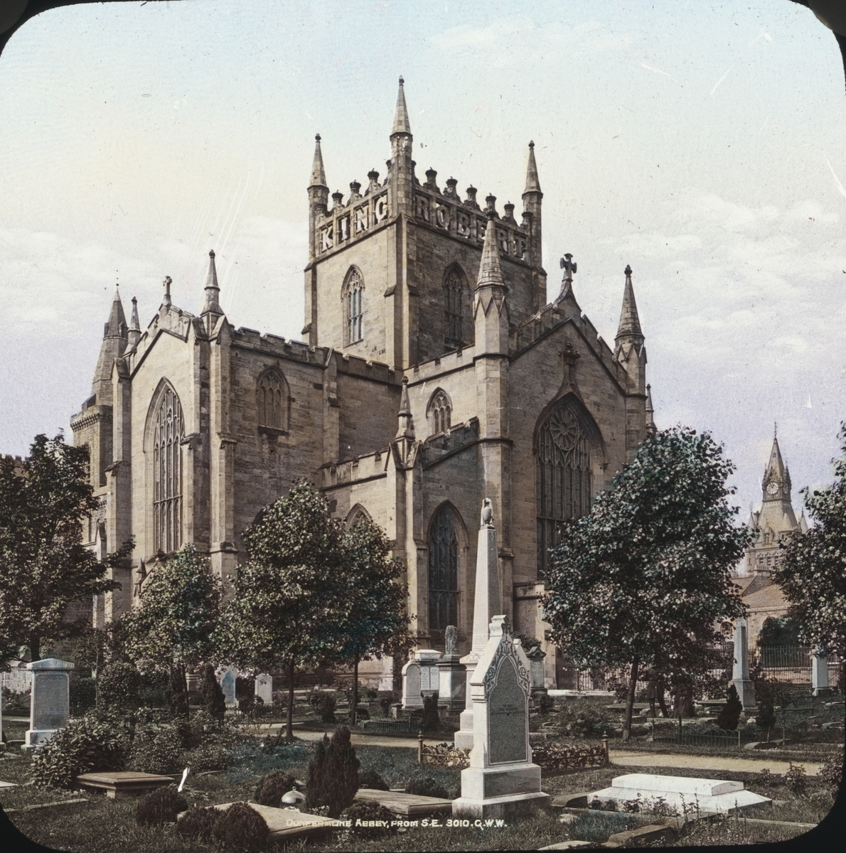 Kolorerad skioptikonbild med motiv av Dunfermline Abbey.