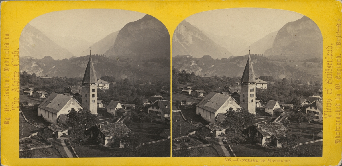 Stereobild med motiv av vy över Meiringen, Schweiz.