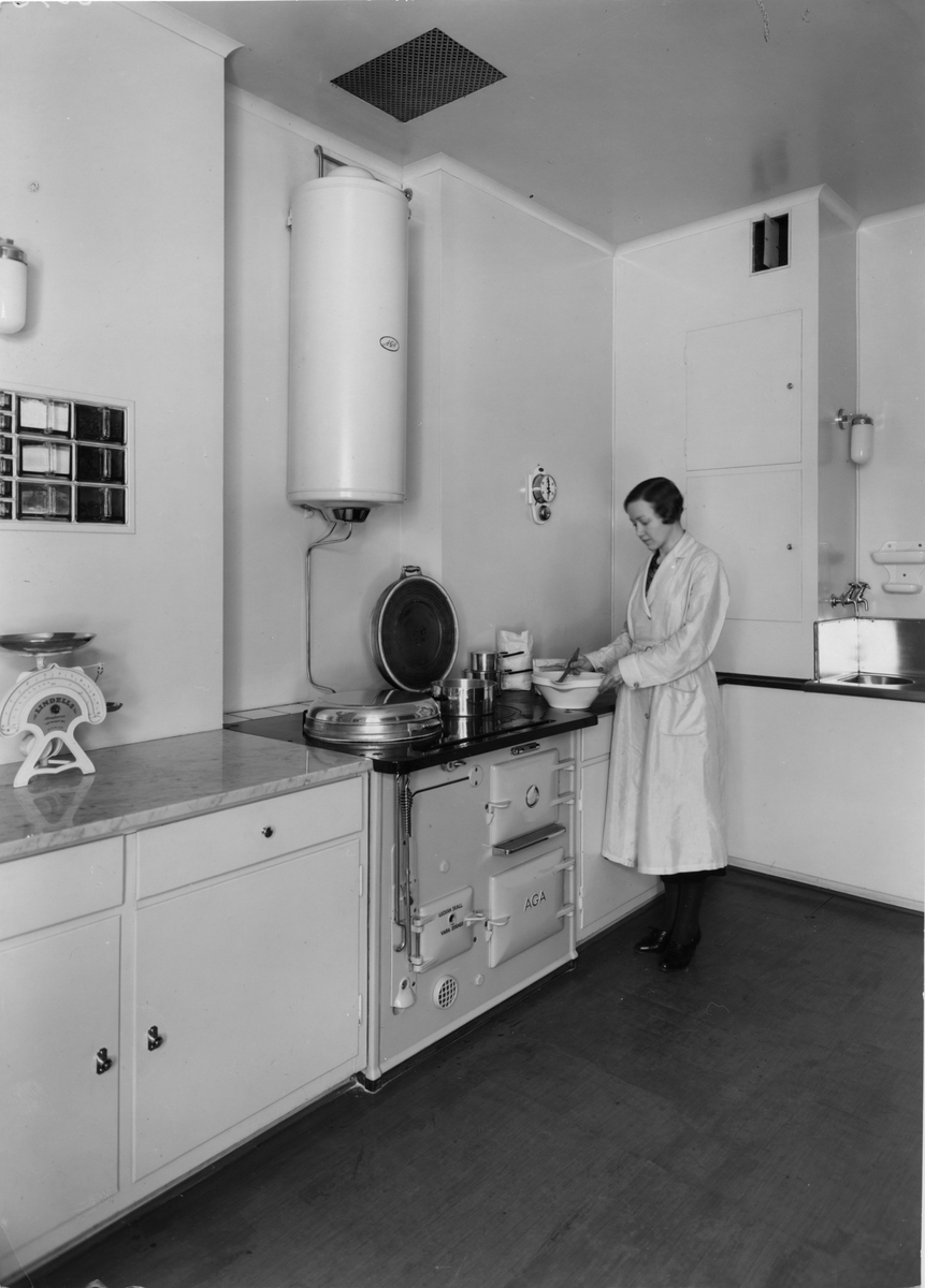 Kokerska vid spis i kök.