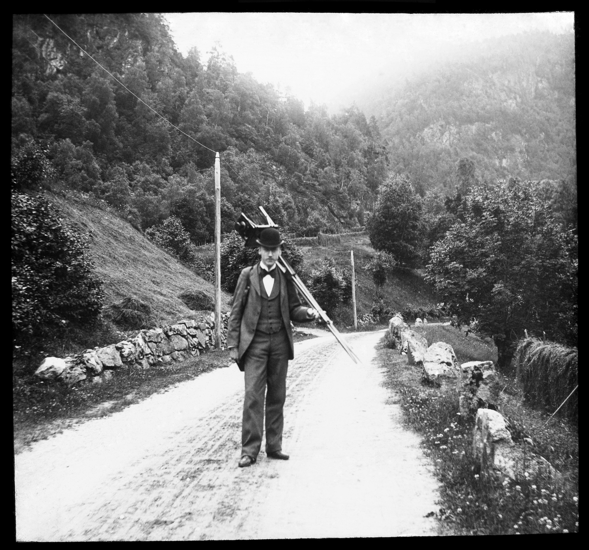 Skioptikonbild med motiv från Allmänna Konst- och Industriutställningen i Stockholm 1897. John Hertzberg med kamera.