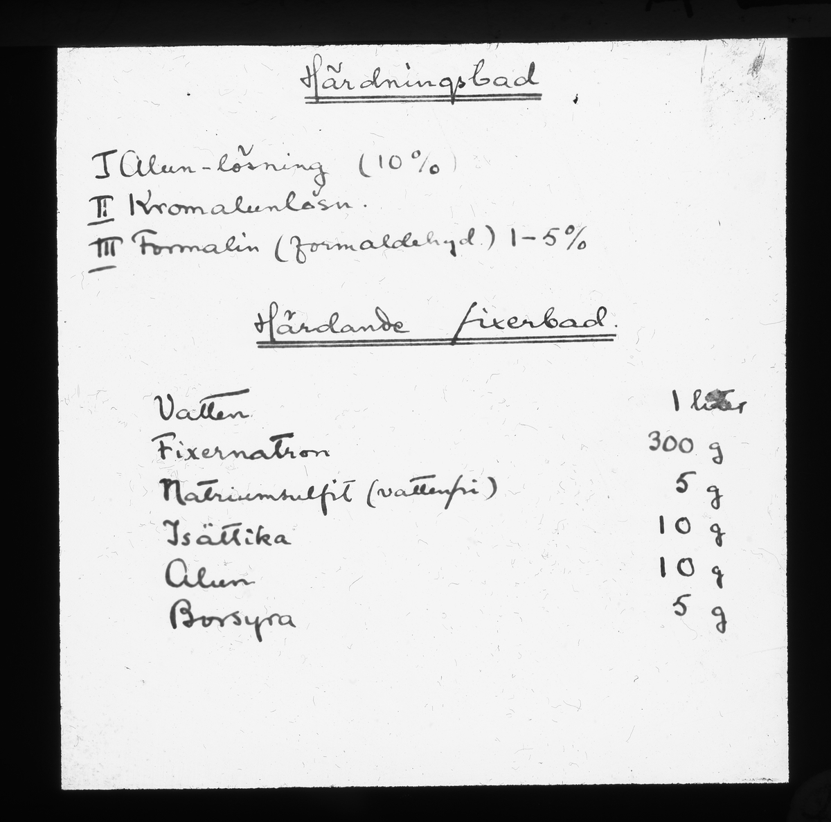 Framkallning. Recept på härdningsbad och härdande fixerbad.