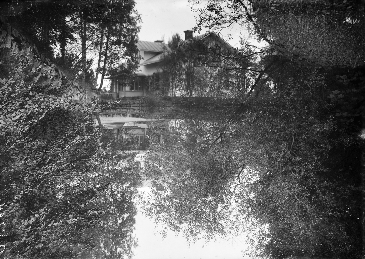 Hus i skogsparti speglar sig i vattnet. Okänd plats.