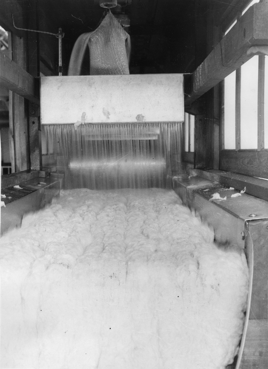 Aktiebolaget Nordisk Silkecellulosa. Ullen rinner ut ur stapelfasmaskinen.