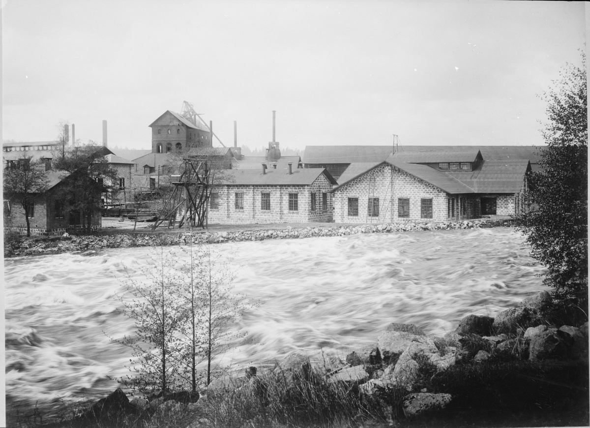Fotografi för produktion av vykort. Tegelbyggnader Degerfors.