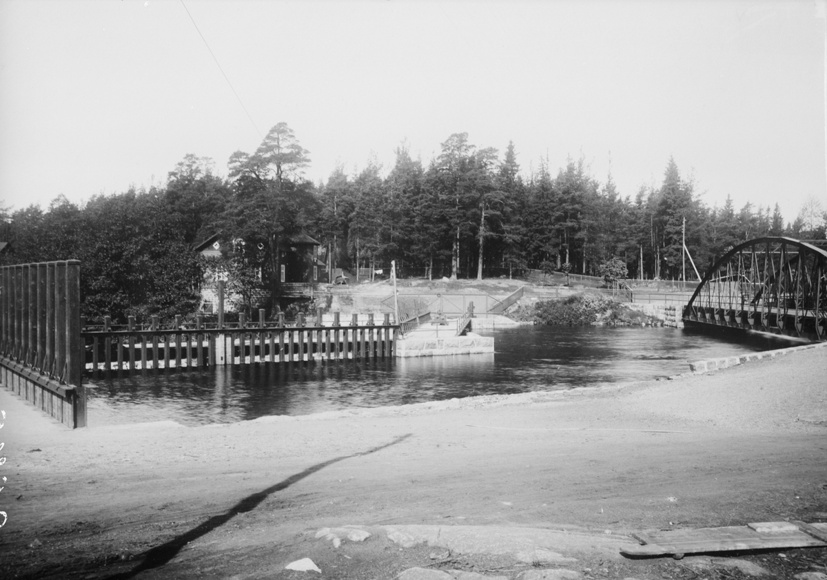 Fotografi för produktion av vykort. Landsvägsbron och dammen i Degerfors.