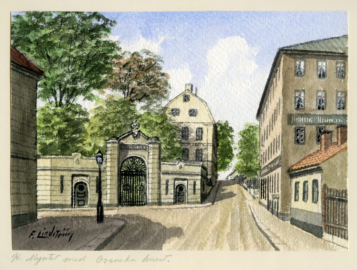 Akvarell med motiv av Kungliga Myntverket och Owenska huset i Stockholm.