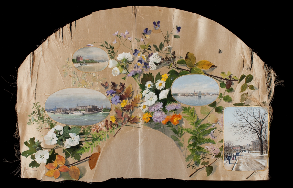 Målning på siden med motiv från Stockholm omgivna av blommor.