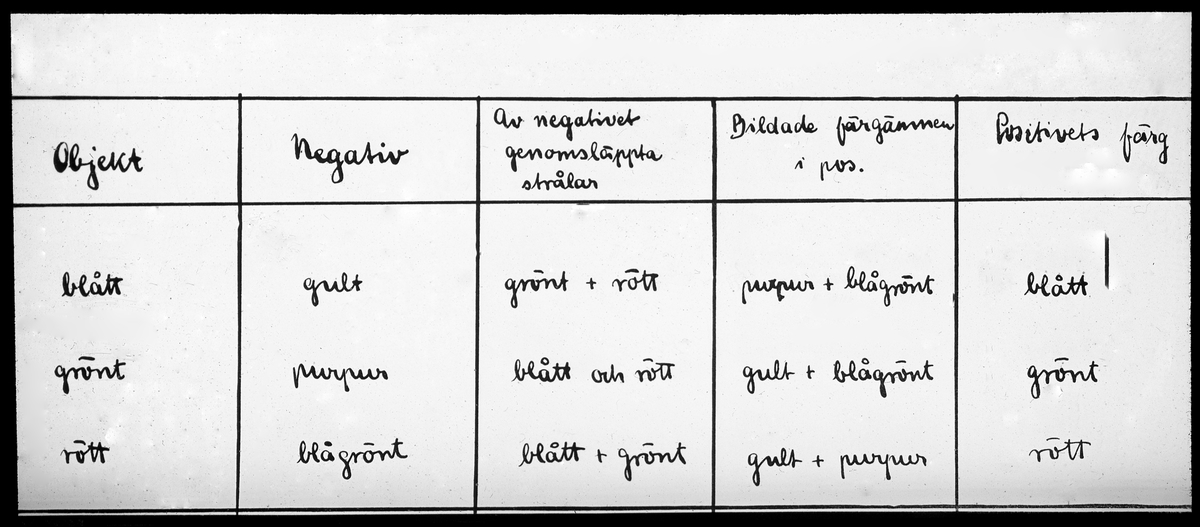 Skioptikonbild från institutionen för fotografi vid Kungliga Tekniska Högskolan. Använd av professor Helmer Bäckström som föreläsningsmaterial. Bäckström var Sveriges första professor i fotografi vid Kungliga Tekniska Högskolan 1948-58. Motiv föreställande "Trefärgsseparering". För mer info se: Bäckström, Helmer. Fotografisk Handbok. Andra omarbetade upplagan. Natur och Kultur. Stockholm. 1958-59. s 1014 och följande.