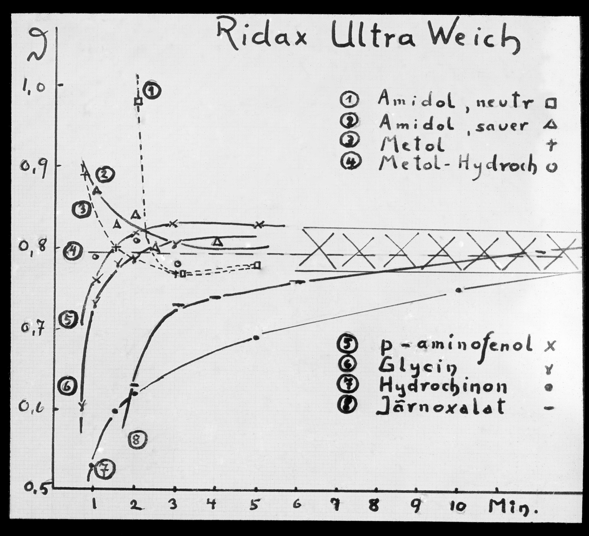 Skioptikonbild från institutionen för fotografi vid Kungliga Tekniska Högskolan. Använd av professor Helmer Bäckström som föreläsningsmaterial. Bäckström var Sveriges första professor i fotografi vid Kungliga Tekniska Högskolan 1948-58. Motiv föreställande "Ridax Ultra Weich".