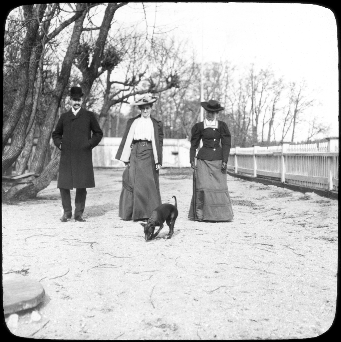 Skioptikonbild från institutionen för fotografi vid Kungliga Tekniska Högskolan. Motiv föreställande sällskap på promenad. Bilden är troligen tagen av John Hertzberg under Allmänna Konst och Industriutställningen 1897.
