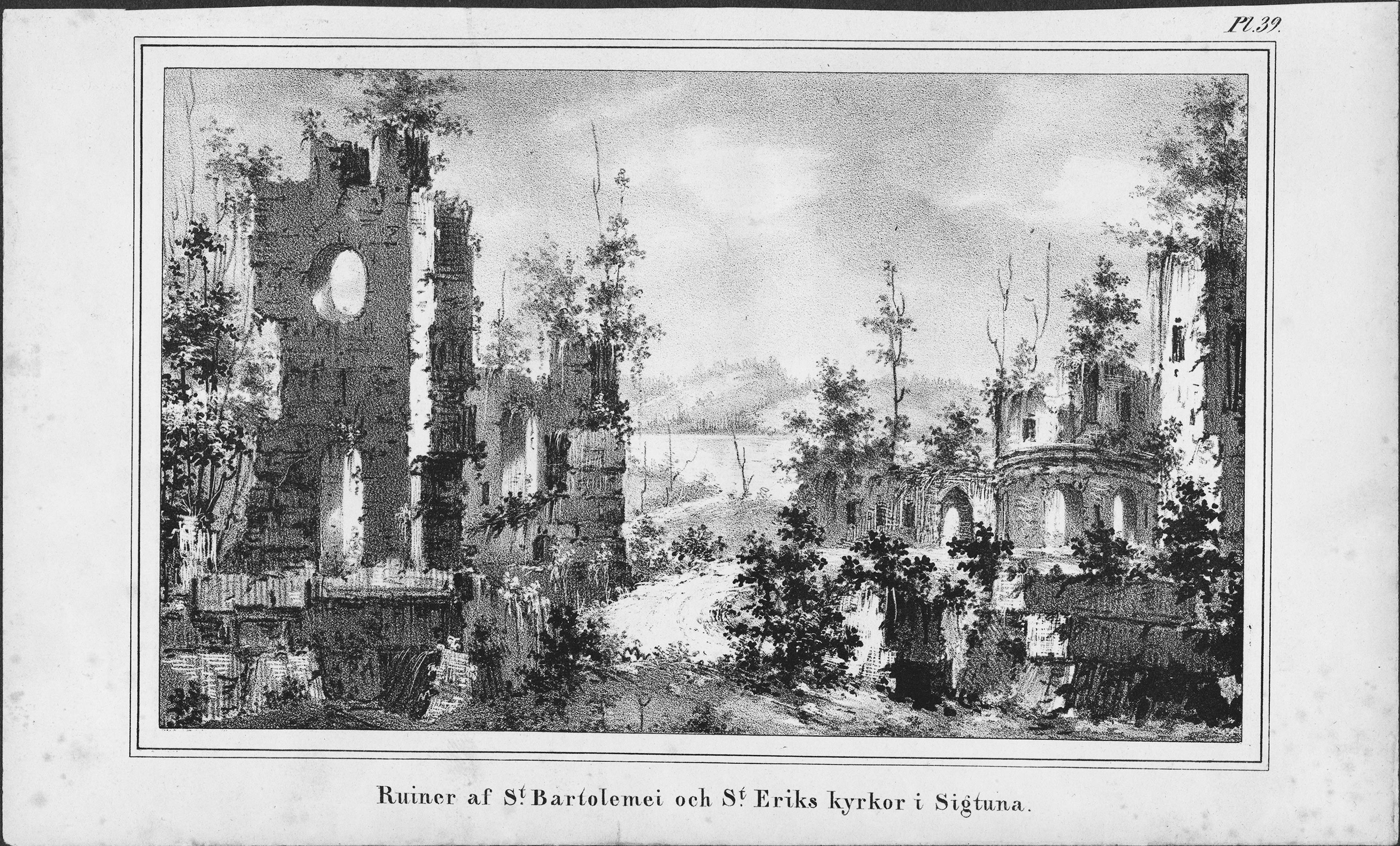 Sankt Bartolomei och Sankt Eriks kyrkoruiner. Litografi ur Svenska Minnen av Anders Lindeberg Stockholm 1837.