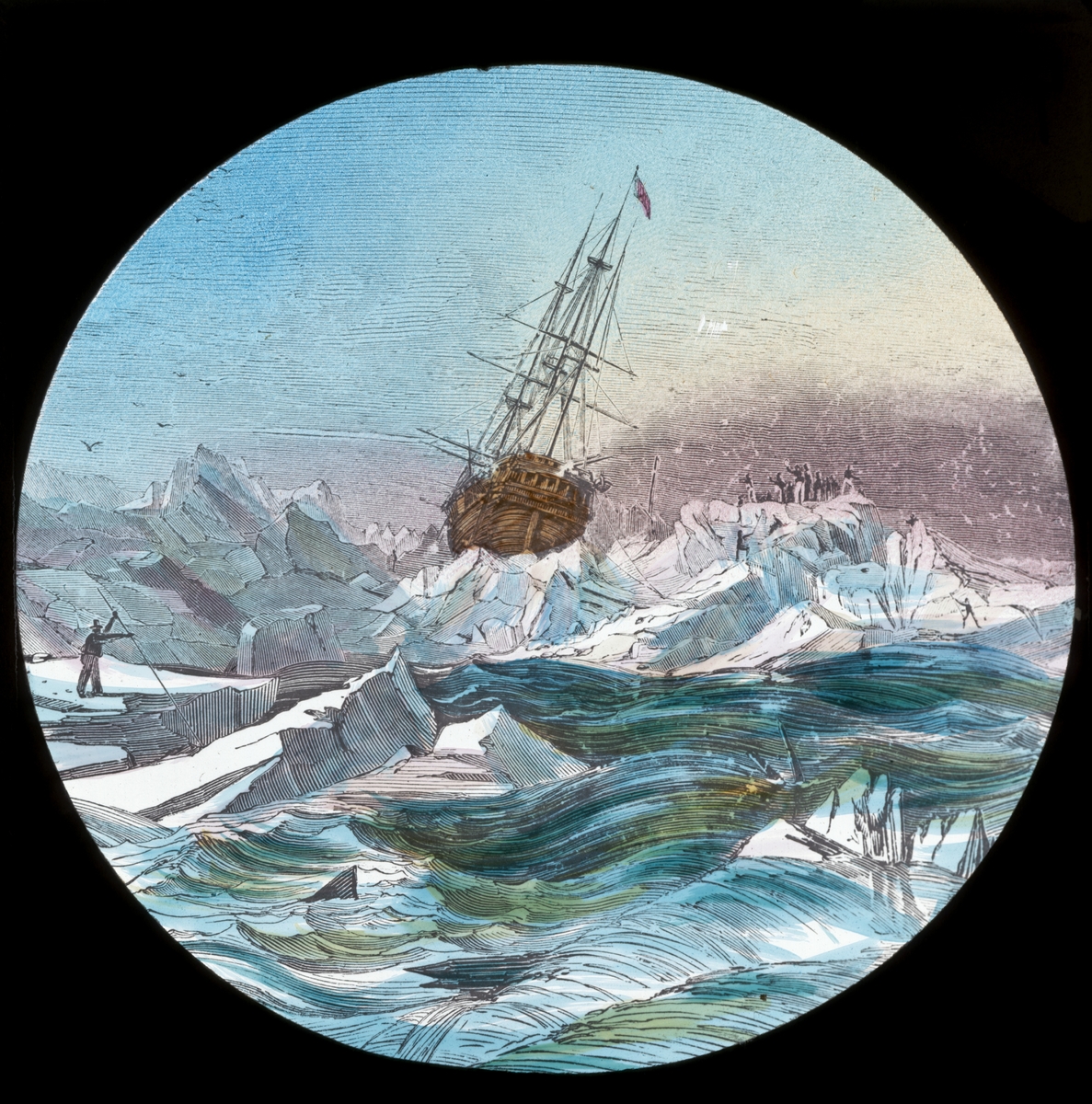 Handmålade ljusbild för skioptikon med motiv av fartyg förtöjt i ishavet med folksamling på isflak.