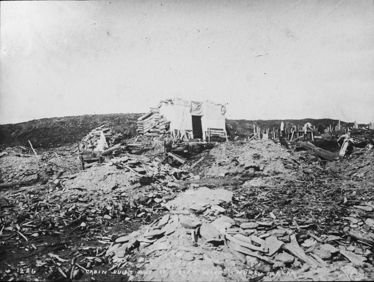 Skioptikonbild med motiv av stuga, byggd av drivved, Alaska.