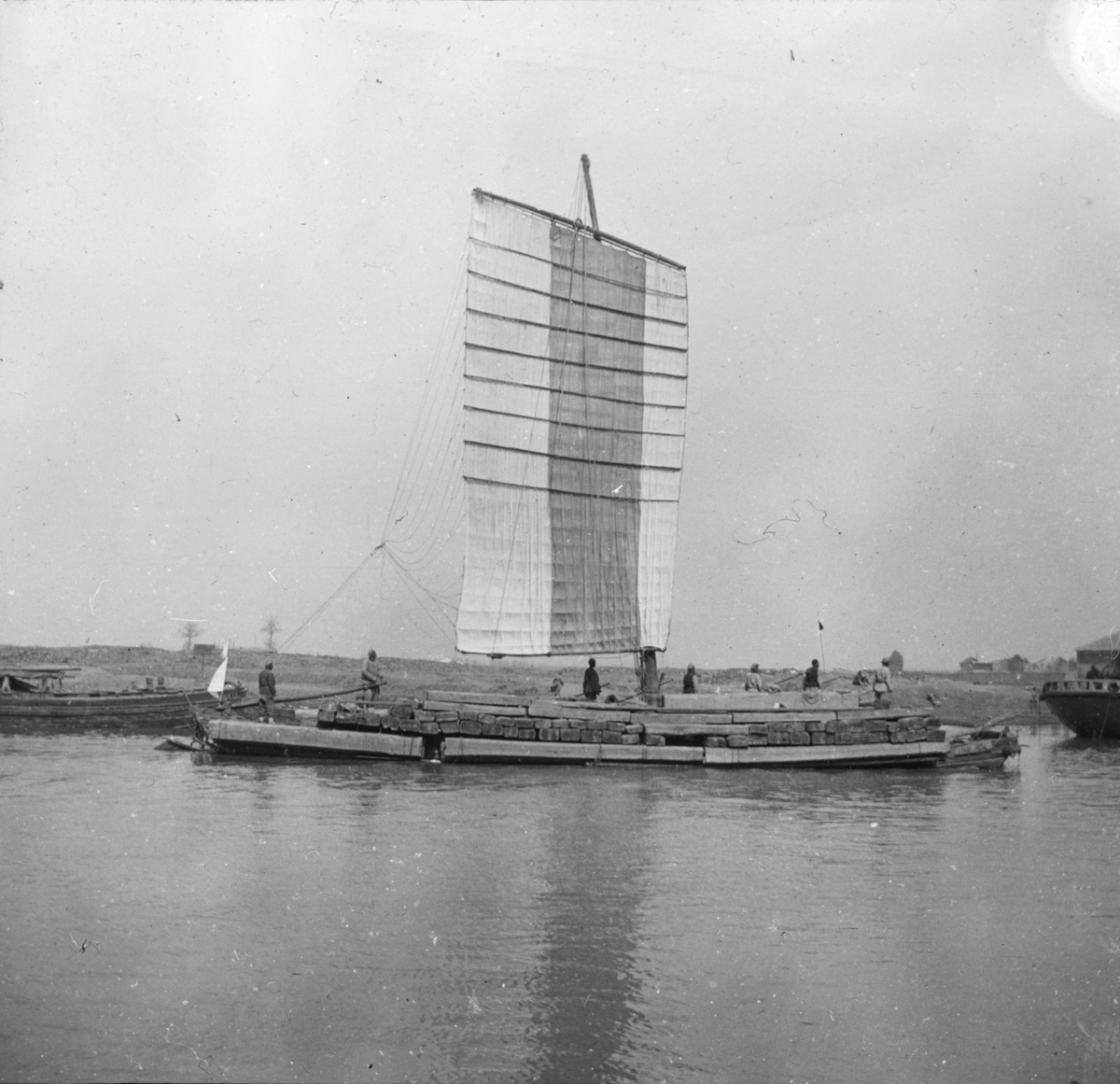Skioptikonbild med motiv lastbåt, segelbåt med virkeslast.