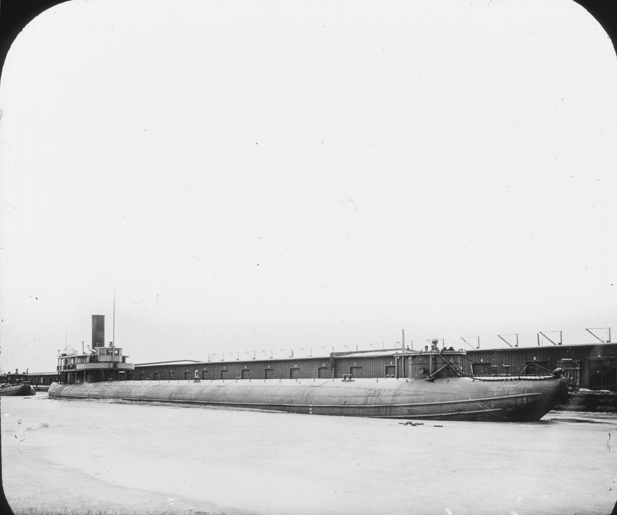 Skioptikonbild med motiv av fartyg. Ett så kallat "whaleback"-fartyg som byggtes för att frakt av bulklast på de storta på de stora sjöarna i Nordamerika.