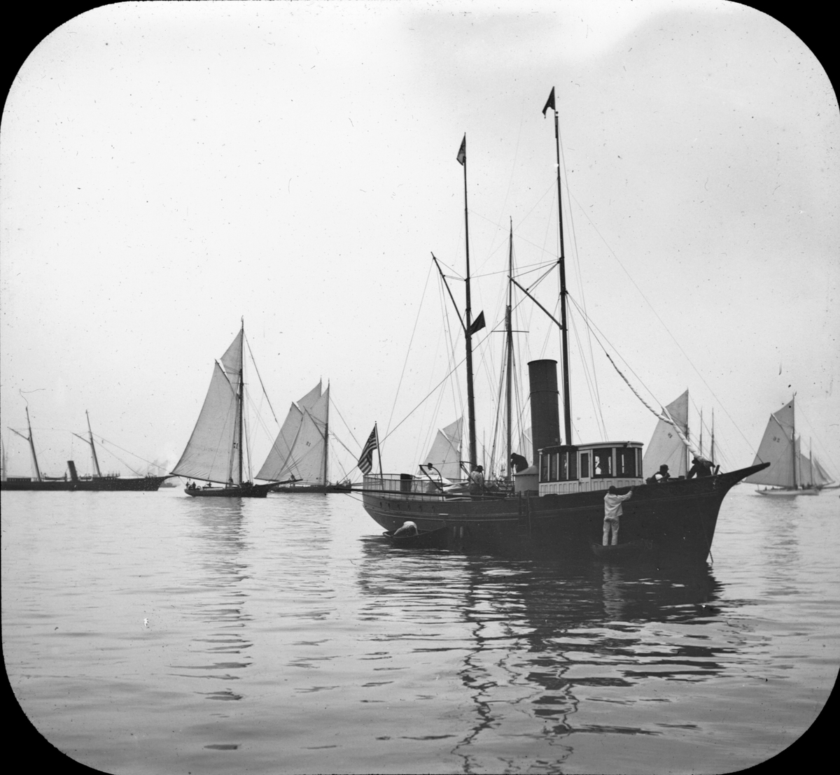 Skioptikonbild med motiv av segelbåtar och ångbåtar.